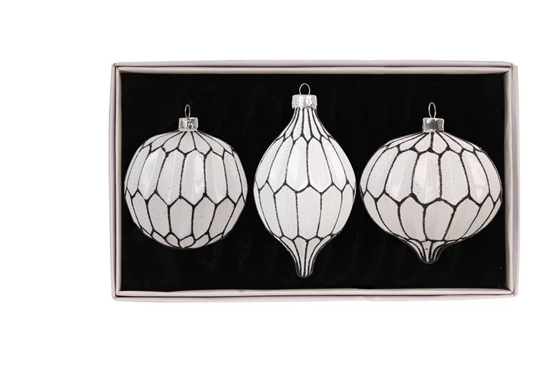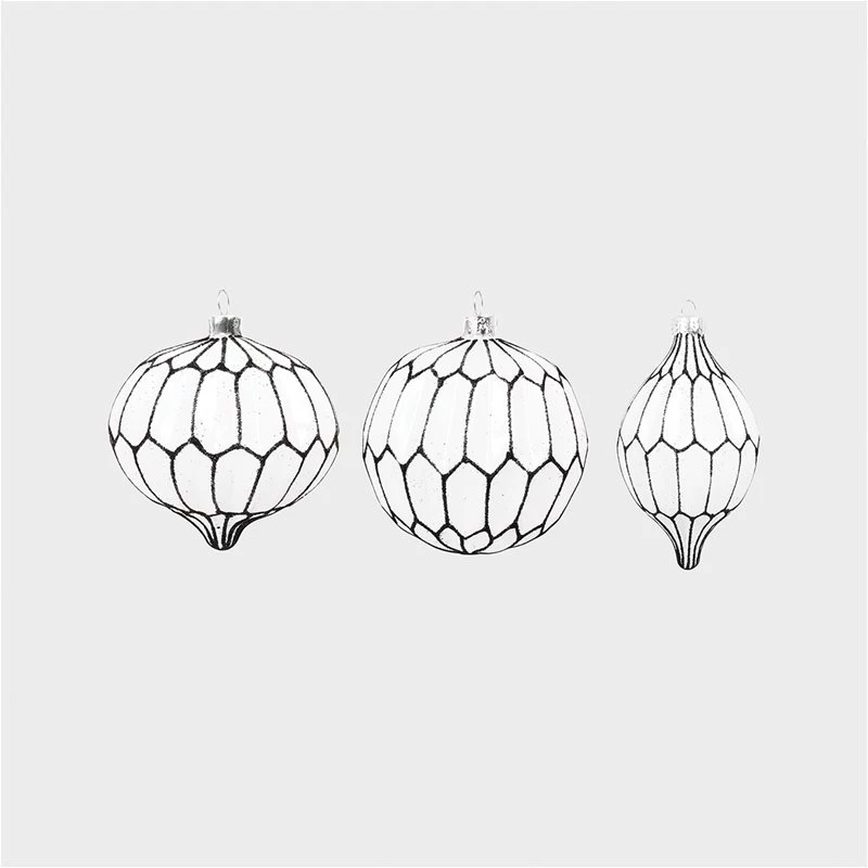 A giftbox full of black and white. Set of 3 graphic ornaments in different shapes and designs.