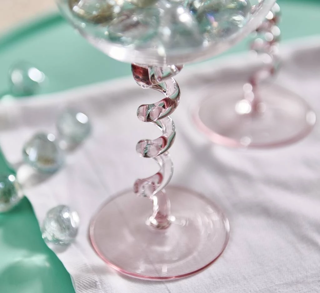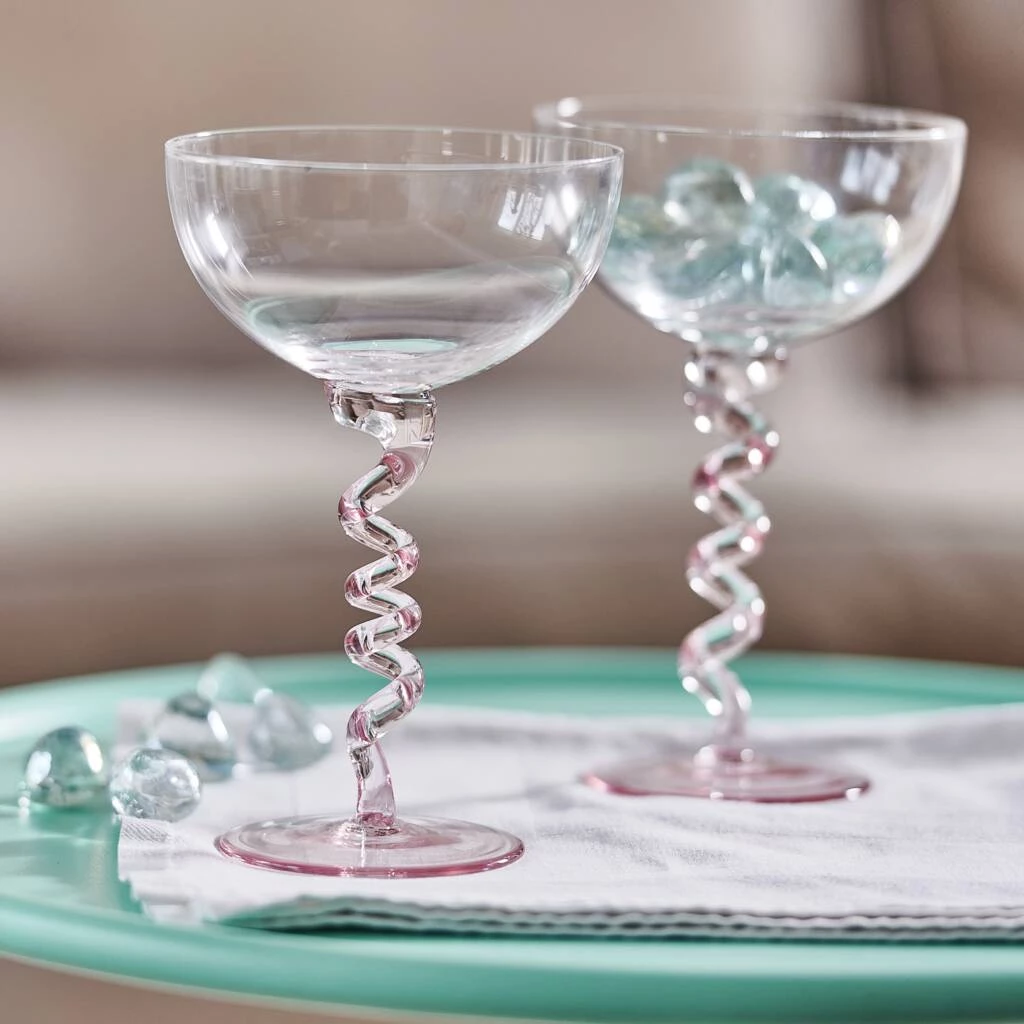 This spiral Champagne/Cocktail Coupe Saucer glass is made from fine glass and has a pink glass stem, perfect for making any important toasts
