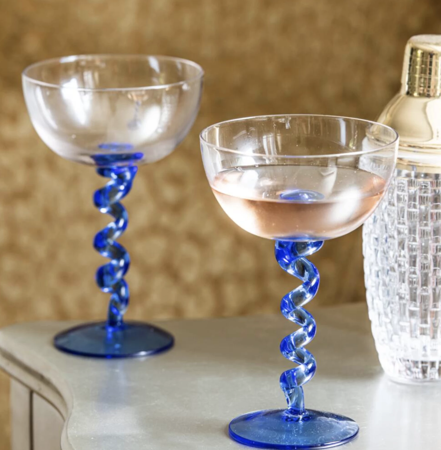 These spiral Champagne/Cocktail Coupe Saucer glass are made from fine glass and have a blue glass stem, perfect for making any important toasts