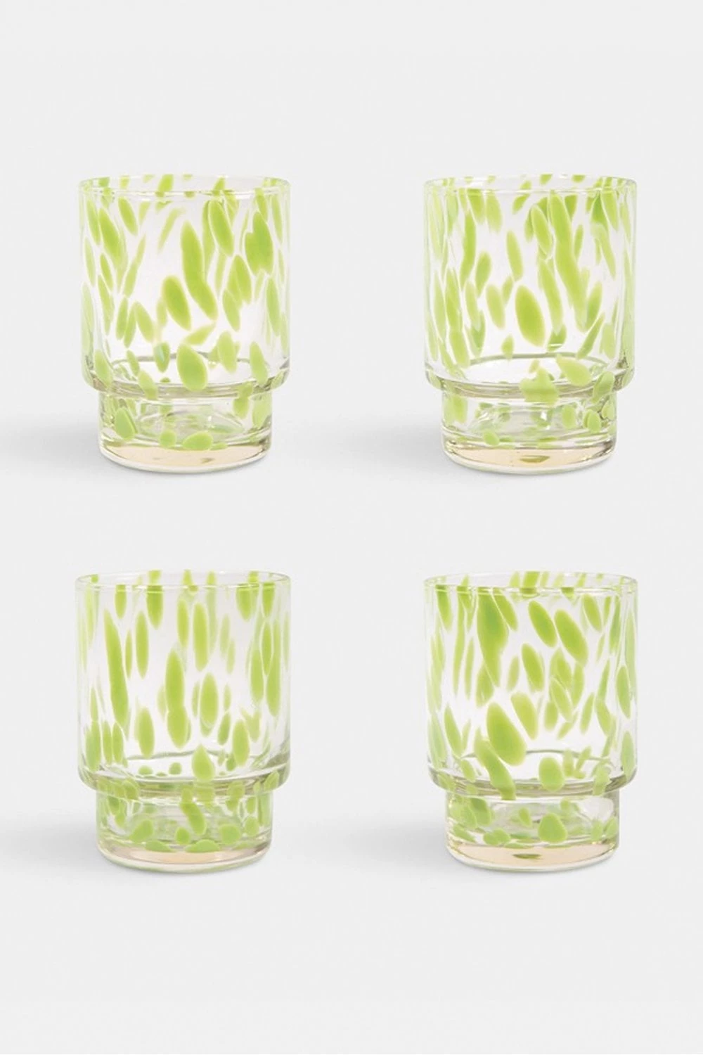 Set of 4 glasses Green tortoise shell design Glass 10 x 8cm Hand blown so colour and pattern may vary Matching carafe available