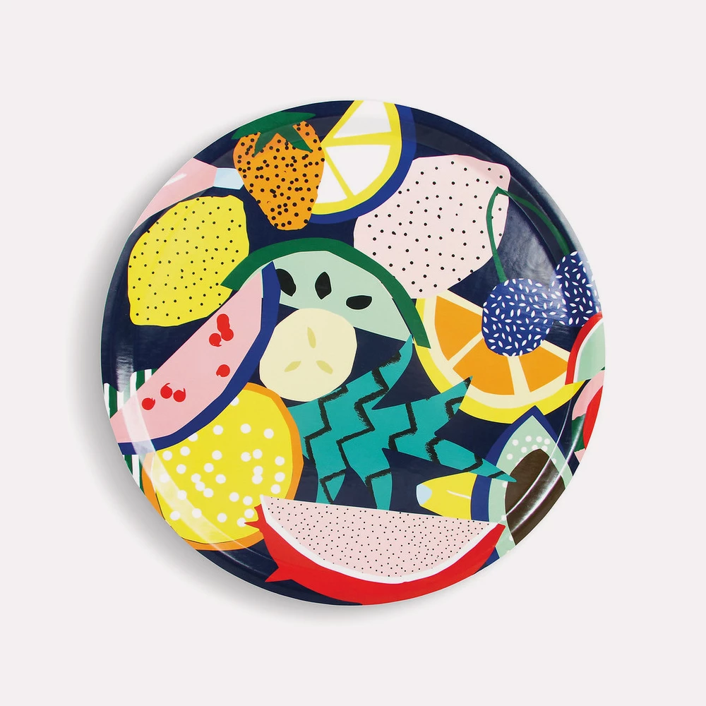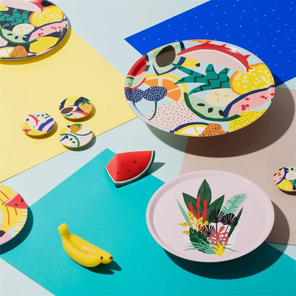 Design by Dutch graphic design duo ‘We are out of office’. The design duo Felix van Dam & Winneke de Groot inspire their bold and colourful work by little rarities they pick up and collect during there travels around the world. For &K they designed a fruits and tropical line. This tray is part of the botanical line and crafted out of durable bamboo.