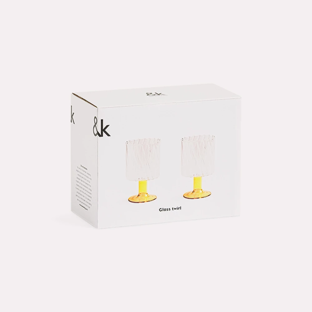 Set of two low glasses in transparent glass with a helical texture and stem and base in smooth, contrasting colored glass. Celebrate a special moment with TWIRL glasses! They’re perfect for your favorite drink or ice cream and look amazing on any table due to their bold use of color and retro shape. 350 ml capacity per piece.
