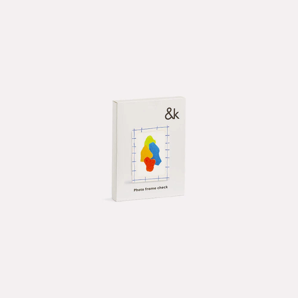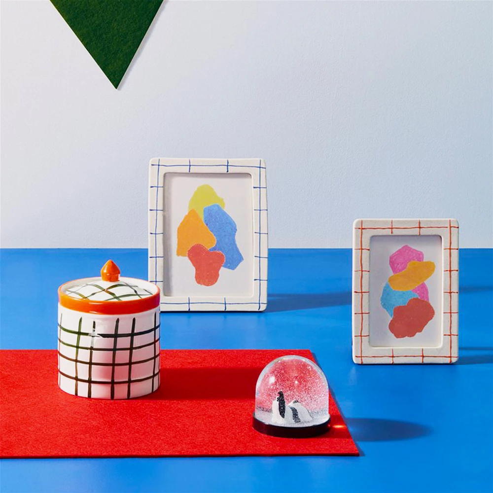 Photo frame made of ceramic with MDF board back. The front frame is enameled in a soft nude color with a glossy finish. The front frame is topped with a rustic texture in a natural color, overlaid with bright blue enameled lines. A stylish and colorful way to frame your most precious memories and keep them always present in your favorite corner.