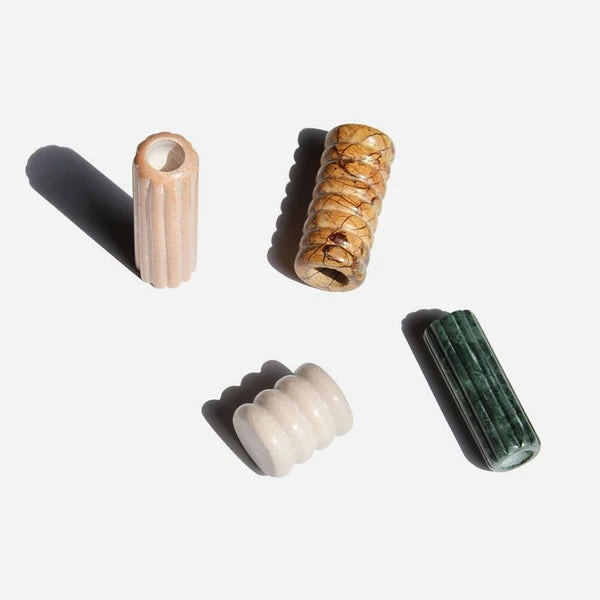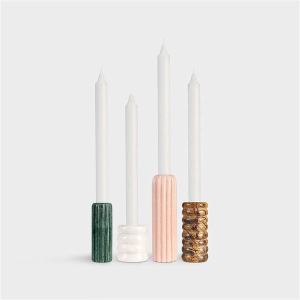 Hand crafted from white marble, this simple yet striking candle holder is perfect for adding a hint of cosy atmosphere to any dinner party. Handmade with a ridged design, each stone piece has a unique colour, and can fit a 2.2cm diameter dinner candle. Riffle White Candle Holder. Sold individually. Made from white marble. Dimensions approx. 6cm (H) x 5cm (Diameter). Holds 2.2cm diameter candles.