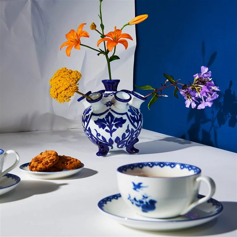 El jarrón tulip está inspirado en los blue prints holandeses de Delfts, hecho de porcelana.