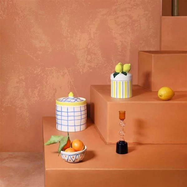 Use this cheerful jar for organizing little items in your living room or kitchen. This design with colourful stripes and fruity lid make sure all your items stay safe inside. The jar is also available in a bigger size. Material: Dolomite Colour: Multicolour Size: 16 x 10cm