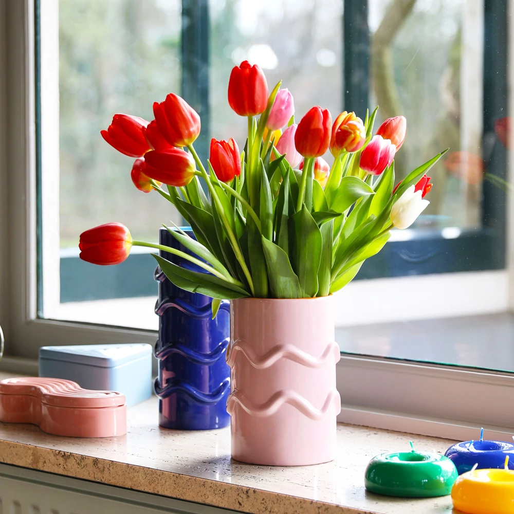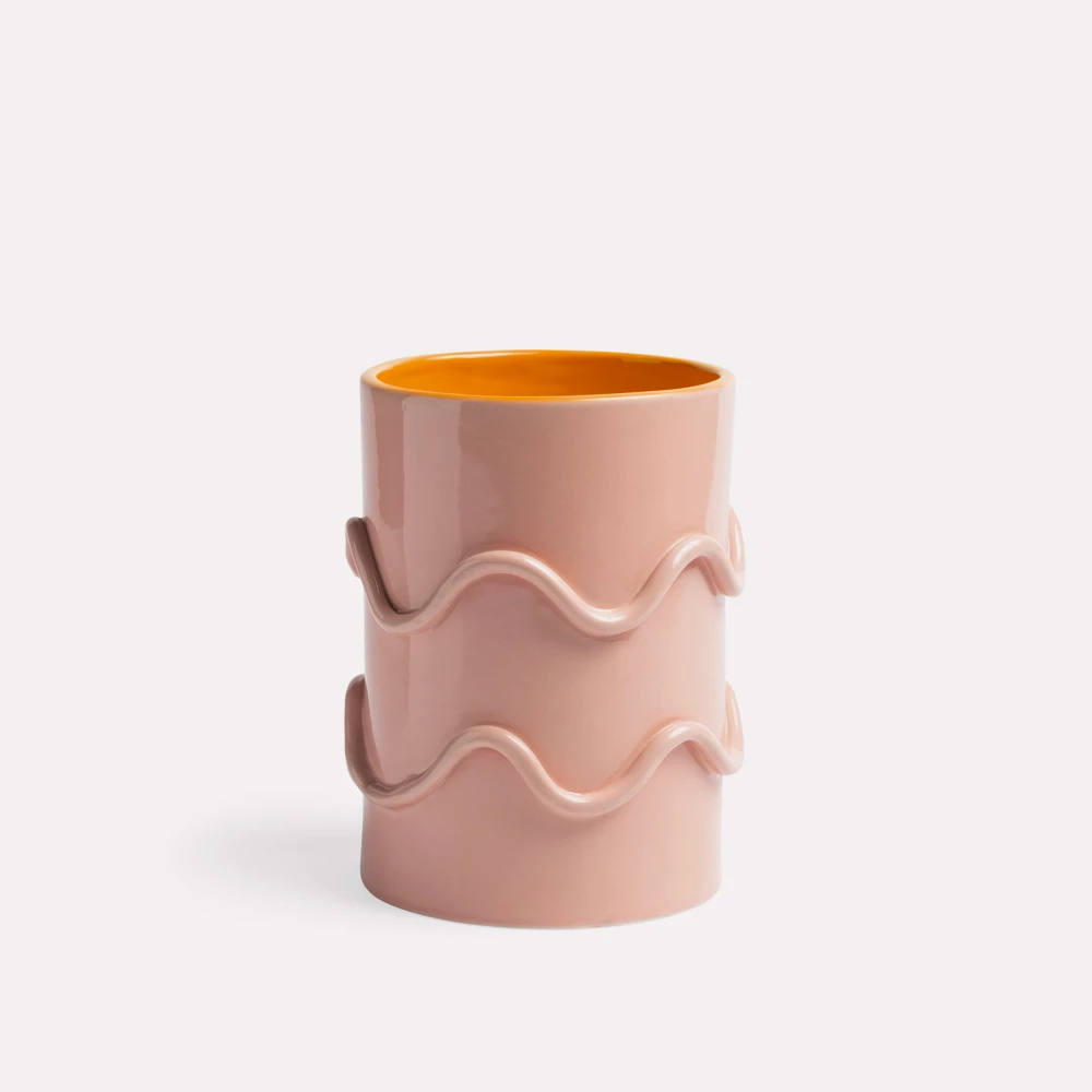Cylindrical vase in enameled dolomite in a contrast of tones between the interior and the interior. The WAVY collection is completed with undulating lines in relief made of the same material, which give it a very special dynamism. A piece in which any floral arrangement will look spectacular. 3.000 ml capacity.